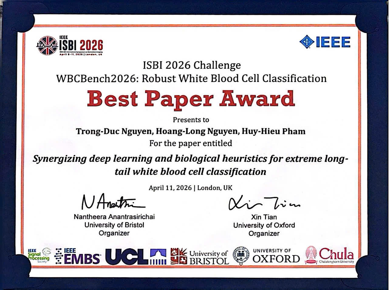 Best Paper Award certificate presented at the ISBI 2026 Challenge for the paper on robust white blood cell classification (cre: Dr. Pham Huy Hieu).